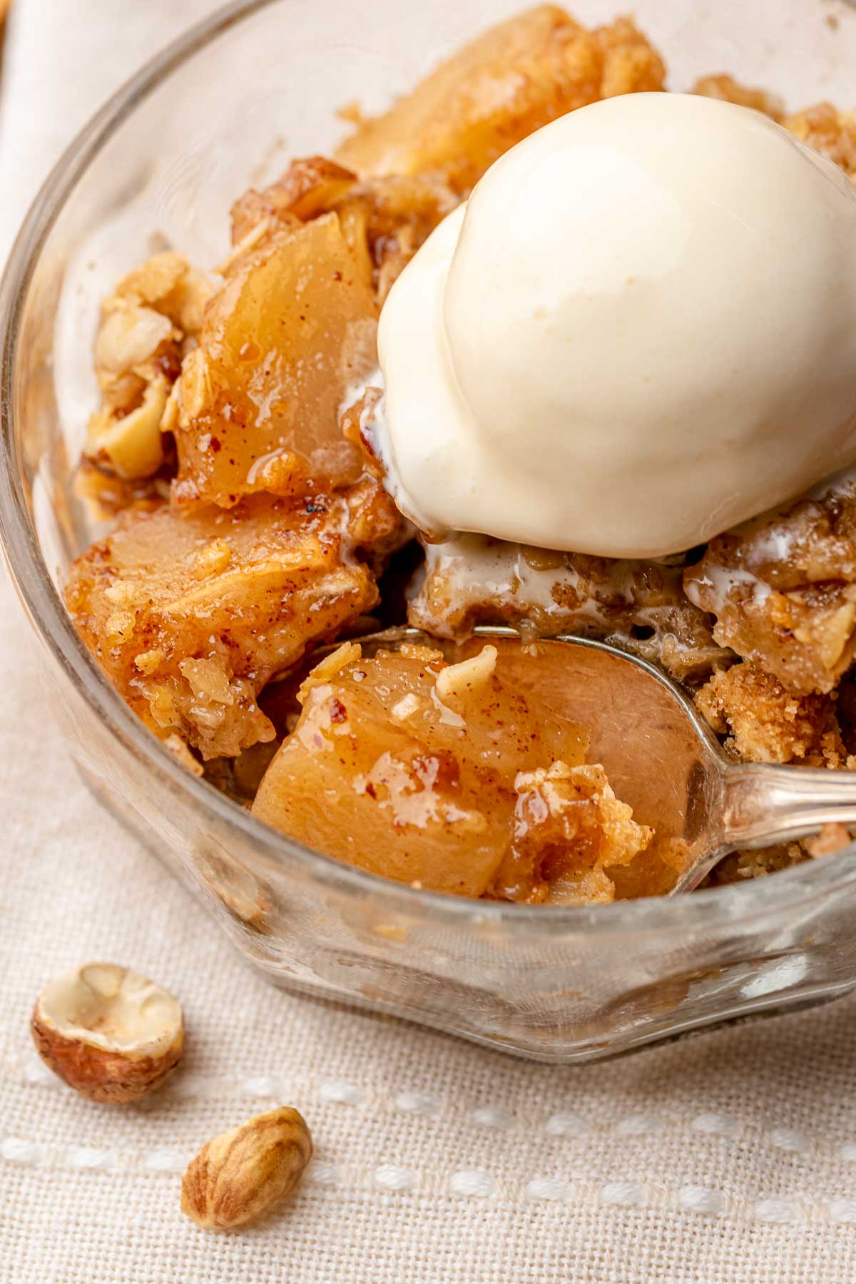 Four: Top with the hazelnut oat crumble and bake until the apples are soft and the topping is lightly browned. Cool slightly, then serve with ice cream!
